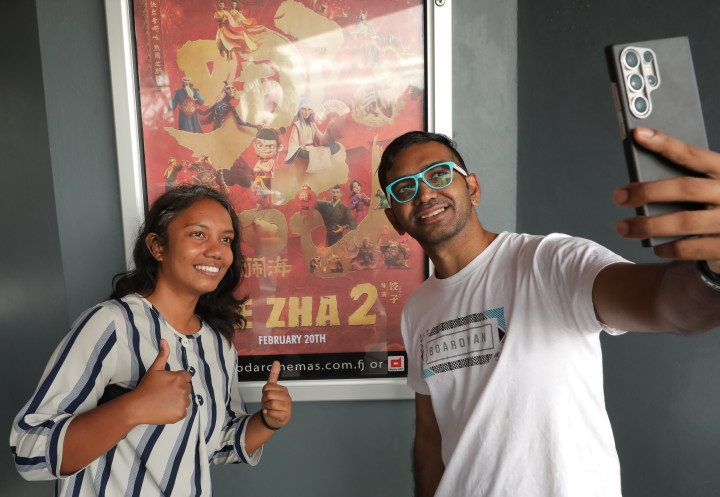 2月20日,在斐济首都苏瓦,观众在《哪吒2》电影海报前自拍。(新华社)